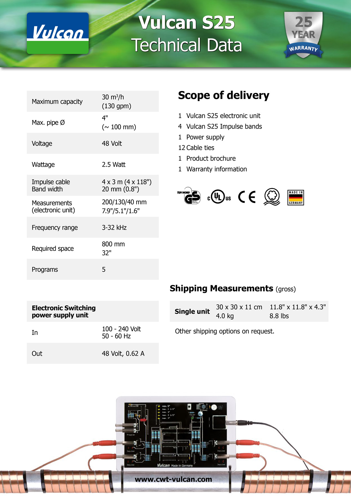 The state of the art vulcan electric impulse frequency descaler is an eco friendly water treatment device that has been perfected over the past 30 years to prevent scale minerals from bonding to surfaces and to remove existing scale buildup.
