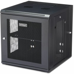 Wall mount cabinet secures and organizes 12u of 19 inch rack equipment in network closets classrooms and other locations with limited floor space.